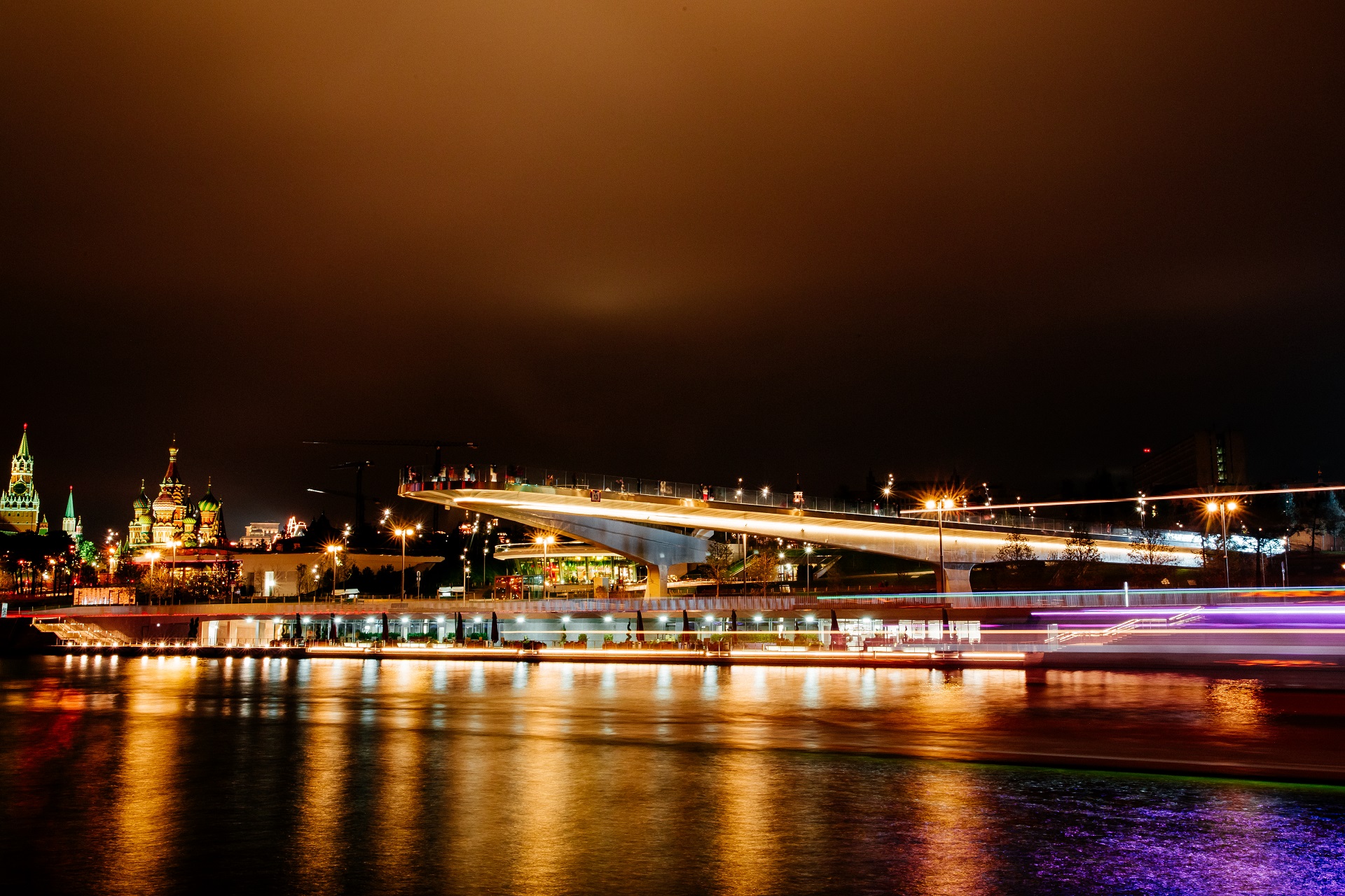 «Парящий мост» – не имеющая аналогов в мире смотровая площадка. Эффект парения над территорией парка и над Москвой-рекой создается за счет формы конструкции в виде латинской буквы V, со смотровой площадкой общей протяженностью в 244 метра.